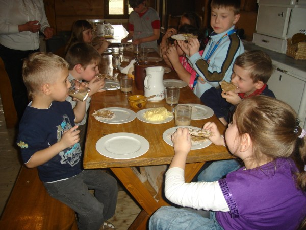 podpłomyków z masłem, smalcem i miodem. Dzieci wróciły bardzo