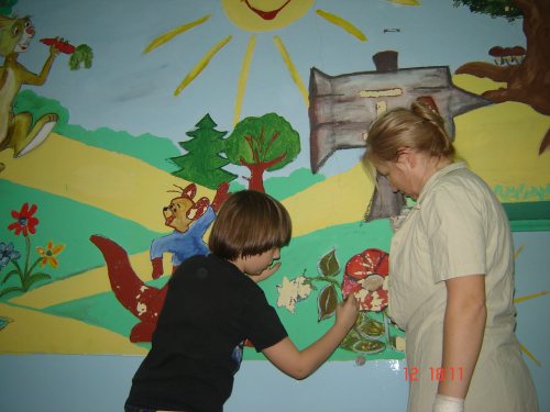 uczestnicy mieli możliwość malowania na ścianach korytarza bajkowych