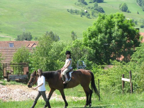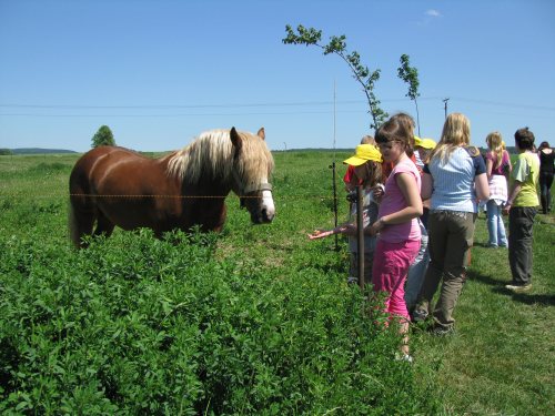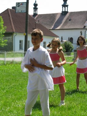 Po południu wybraliśmy się pociągiem do Dlouhiej Trebovej. Tam trzeba było wdrapać się na wzgórze. Tam obejrzeliśmy stadninę koni. Największą atrakcją były małe źrebaczki oraz to, że właściciele pozwalali dzieciom karmić konie suchym chlebem. Wszyscy też spróbowali jazdy konnej, a potem podziwiali skoki przez przeszkody. Kiedy nad ogniskiem piekły się nasze kiełbaski, dzieci ujrzały za płotem małe, górskie kózki. Gospodarze pozwolili je karmić, a one ze stoickim spokojem znosiły głaskanie dziesiątek małych rączek.