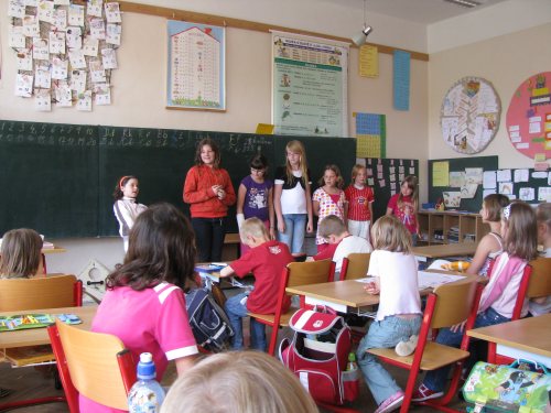 Pojechaliśmy pociągiem do stacji Svitavy - Lancov, by wiejską drogą wśród pól dojść do małej wiejskiej szkółki w Opatovcu. Mała - ale jak wyposażona! Nowiutkie ławki, nowe komputery, świeżo wyremontowana stołówka... A uczy się tam obecnie 25 uczniów! Przedstawili dla nas prezentację na temat Czech i Polski, a także pokazy taneczne. Potem udzielaliśmy wywiadu, szczególnie na temat szkoły w Polsce. Czeskie dzieci były zdziwione, że najwyższą oceną jest szóstka, gdyż u nich piątka jest najniższą oceną, a jedynka najwyższą. Kiedy świetnie bawiliśmy sie w niewielkiej, ale bogato wyposażonej sali gimnastycznej, okazało się, że juz nadjechał bus, którym mieliśmy wracać do domu. Zaprosiliśmy naszych czeskich przyjaciół do nas w przyszłym roku!